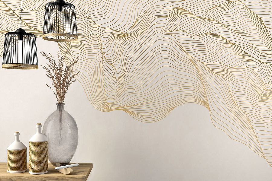 В этом дизайне линия передает игру света и тени - за счет переливов цвета создает иллюзию присутствия золота. За счет линии проявляется многослойный объем композиции.