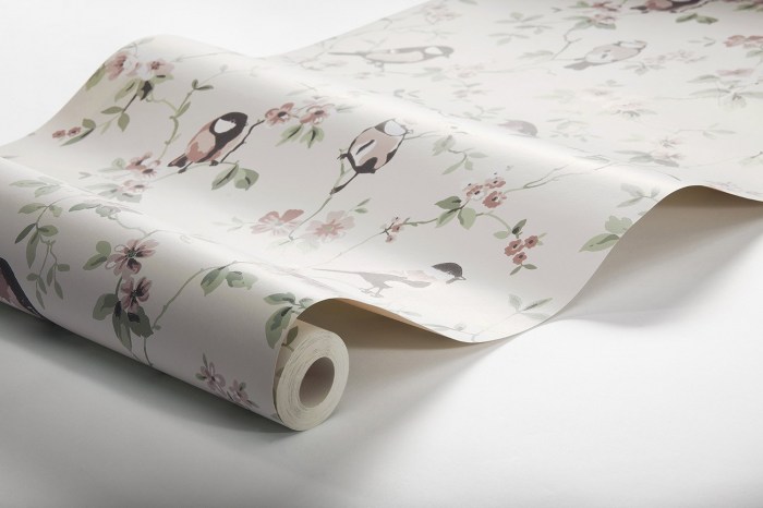 На обоях Falsterbo Birds из коллекции FALSTERBO III от шведского произодителя обоев BORASTAPETER изображена идиллическая сцена с певчими птицами, сидящими на филигранно прорисованных цветущих ветвях.