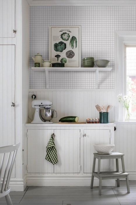 Простой и скромный узор обоев Frida из коллекции FALSTERBO III от шведского произодителя обоев BORASTAPETER вдохновлен традиционными клетчатыми кухонными скатертями и полотенцами.