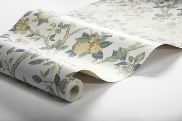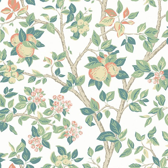 Затейливый рисунок обоев Ingrid Marie из коллекции FALSTERBO III от шведских обоев BORASTAPETER изображает пышные яблоневые ветви на темно-синем фоне.