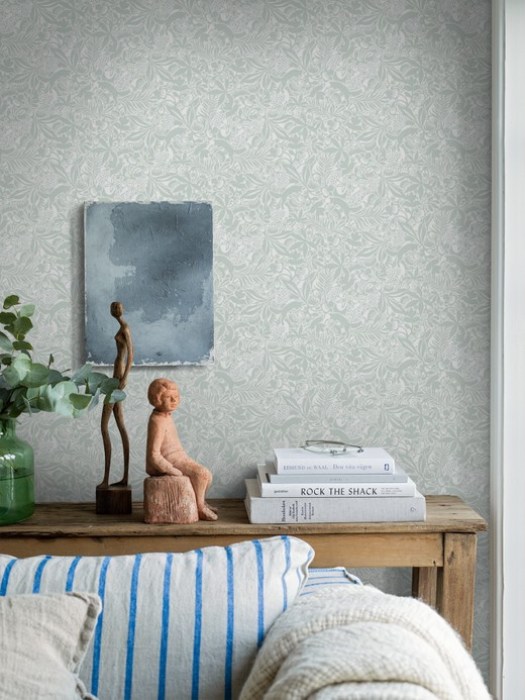 В коллекции шведских обоев WONDERLAND данный дизайн присутствует в двух нейтральных расцветках: серый рисунок на белом фоне и светло-зеленый на белом фоне.