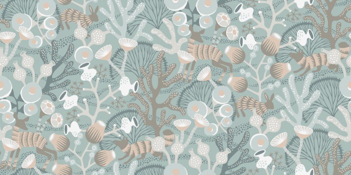 Такой мир существует, если просто на минуту закрыть глаза. Представьте, что вы оказались в загадочном месте, где морские кораллы растут на летней полянке, а кролики, вдохнув поглубже, ныряют в свои норки. Эти игривые обои присутствуют в коллекции в 4 цветовых различных цветовых гаммах: нежное сочетание пастельных голубых, бежевого и белого цветов на фоне цвета утиного яйца, сочетание зеленого хаки и цвета синих водорослей на темно-сером фоне, игра дынно-желтого, кораллово-красного и синего с зеленым на черном фоне а также яркая композиция красного, синего, зеленого и желтого на белом фоне. Также этот рисунок представлен в виде прекрасного фотопанно.