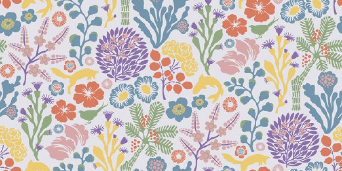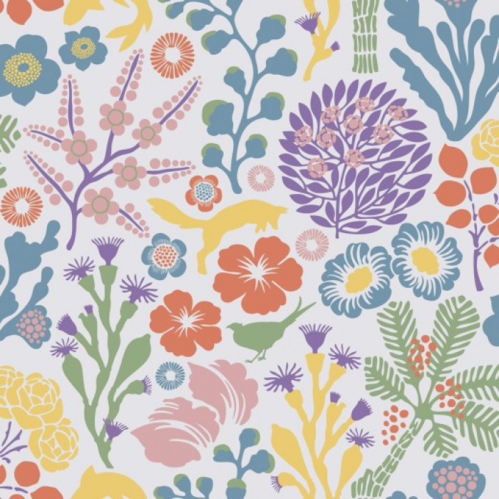 В коллекции Wonderland от BORASTAPETER представлено два цветовых решения этого рисунка: приглушенные сочетания синего, бежевого и зеленого на белом фоне и яркая комбинация кораллового, синего, желтого, зеленого и фиолетового, также на белом фоне.