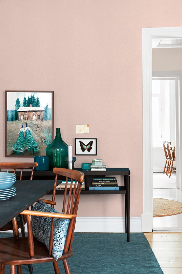 Однотонные обои Pink Blush с матовым покрытием романтичного светло-розового оттенка из коллекции Pigment от шведского производителя Borastapeter наполняют пространство естественным светом.