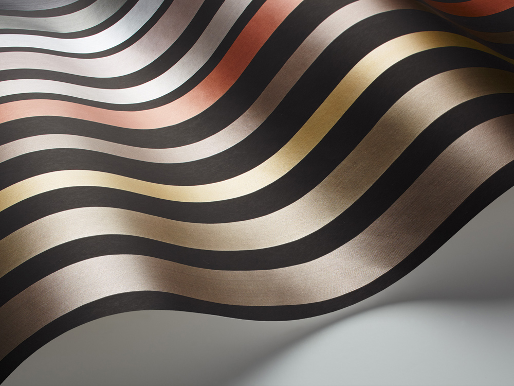 Однако, несмотря на всю технологическую сложность изготовления, эти обои, в которых на матовом серо-бежевом или угольно-черном фоне сбегают вниз сверкающими лучами структурированные полосы мерцающего металлика десяти разных оттенков, делают интерьер живым, вибрирующим, и создают волшебное ощущение праздника.