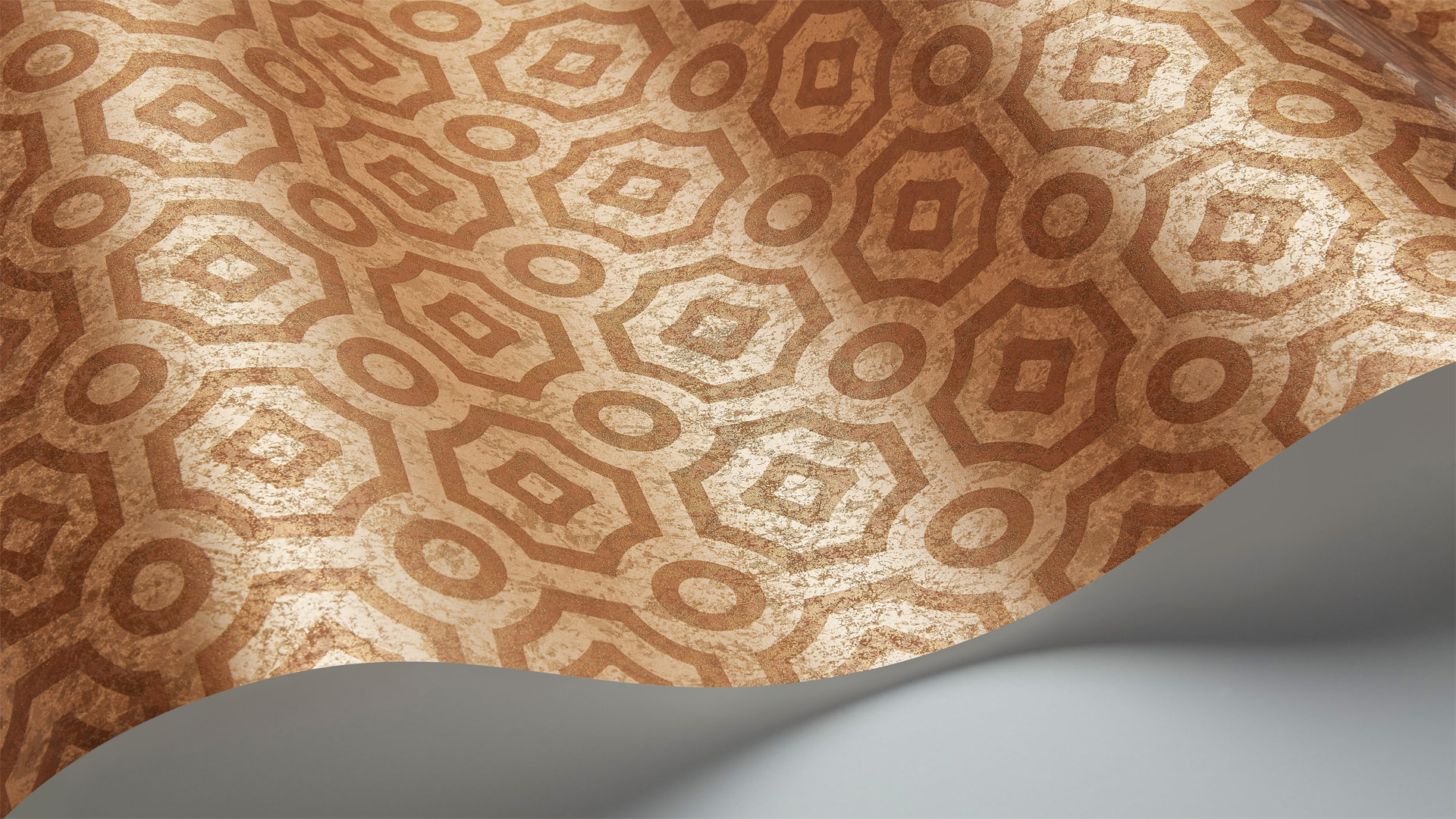 Особое внимание дизайнеров Cole & Son привлекли неправильные восьмиугольники в угловых виньетках росписи, которые и были трансформированы в сдержанно-элегантный орнамент Queen’s Quarter, выполненный на металлике цвета старинного золота с изумрудными узорами.