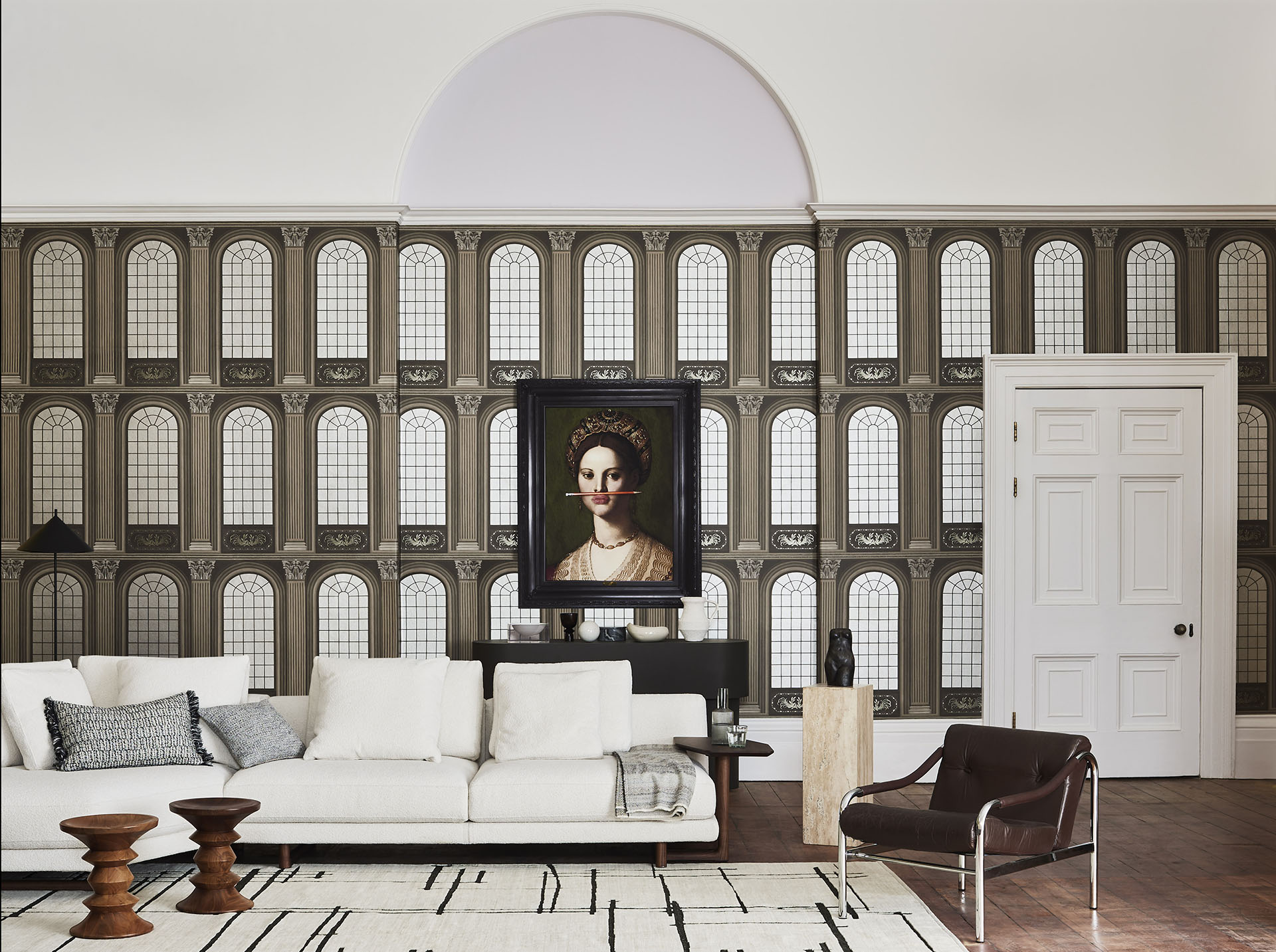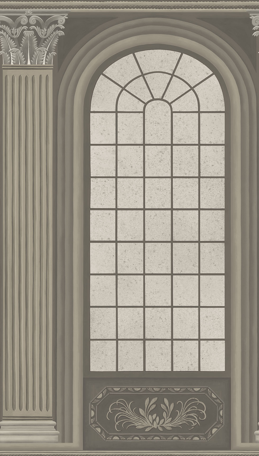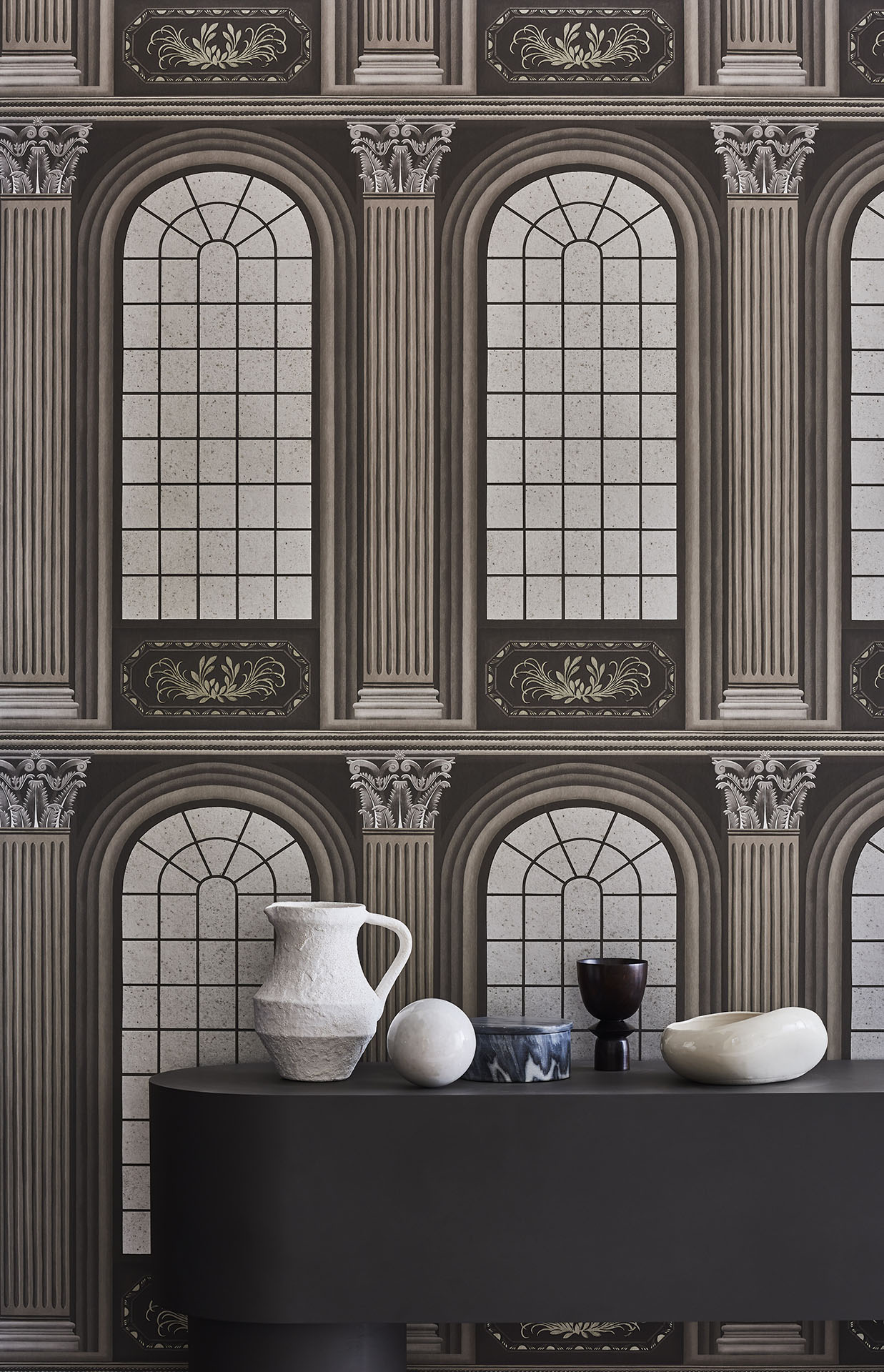 Verrio Mirrors можно сочетать с флизелиновыми обоями King’s Argent и Fresco Sky, дабы придать завершённый вид этой чарующей сцене. Колонны и окна выполнены в цвете сажи с элементами серебристого металлика.