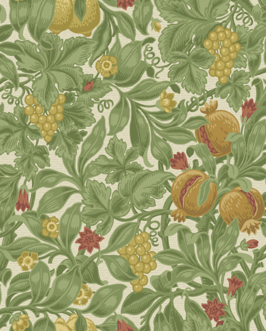На рисунке обоев серии VINES OF POMONA в коллекции THE PEARWOOD COLLECTION от английского производителя обоев Cole&Son изображено множество фруктовых даров и садовых лоз из щедрого рога изобилия.