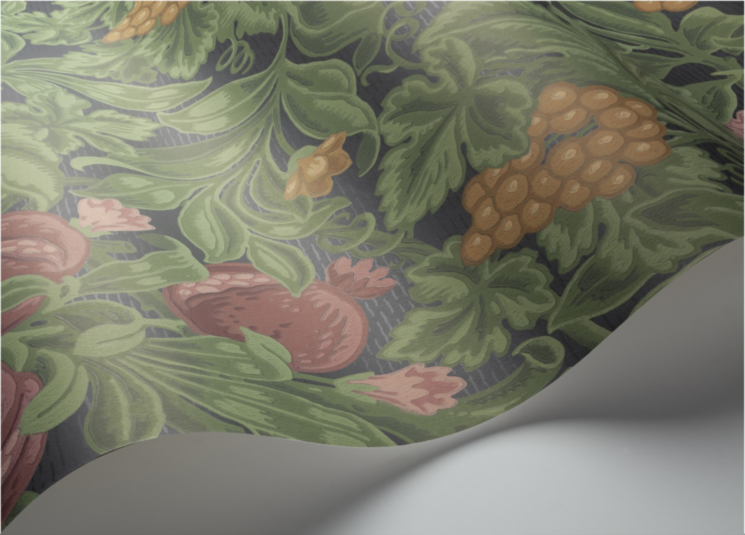 На рисунке обоев серии VINES OF POMONA в коллекции THE PEARWOOD COLLECTION от английского производителя обоев Cole&Son изображено множество фруктовых даров и садовых лоз из щедрого рога изобилия.