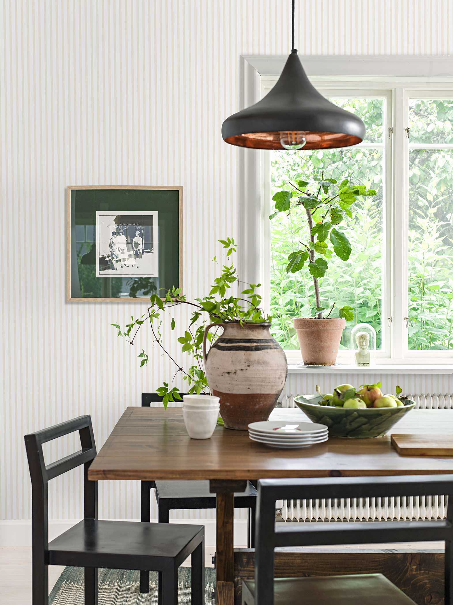 Если вы хотите придать комнате особенно элегантный вид, сочетайте Salongsrand с узором Acanthus. Salongsrand — поистине универсальные обои, открывающие широкий простор для творчества.